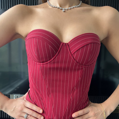 This corset features a bustier neckline and is designed with structured boning for support, crafted from a stylish pinstripe fabric. The dramatic bottom cut elegantly defines your silhouette. Strategically placed push-up pads enhance your shape, while adjustable drawstrings at the back ensure a perfect fit. A side zipper allows for effortless wear.