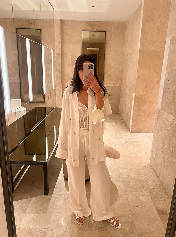 Designed with a generously flowing silhouette, this set is made from a cotton-satin blend. The lightweight fabric ensures comfort and a graceful fit. The dainty flower embellishments on the shirt exude a sense of understated elegance, adding a touch of sophistication without being too flashy making it the perfect choice for both casual and semi-formal occasions.