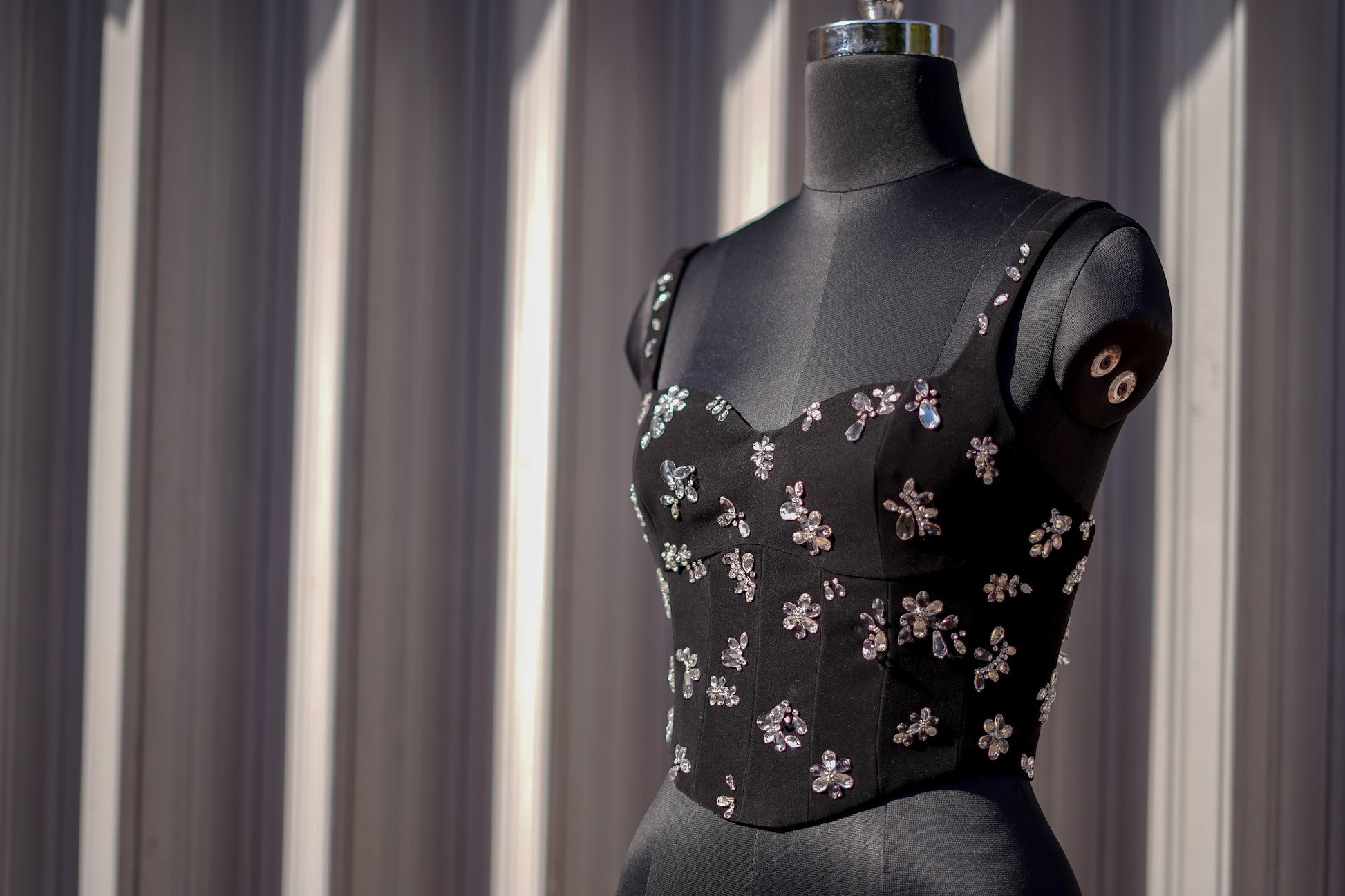 Designed for both style and comfort, the structured boning of the bustier provides support and creates a flattering silhouette, accentuating the curves of the wearer. The delicate embroidery is further enhanced by the addition of sparkling crystals that catch the light, and shimmer with every movement. The back of the bustier features a captivating lace-up detail. Intricately laced satin ribbons elegantly weave through metal eyelets, allowing for a personalized fit. The sweetheart neckline adds a touch of femininity, framing the décolletage with elegance & allure.